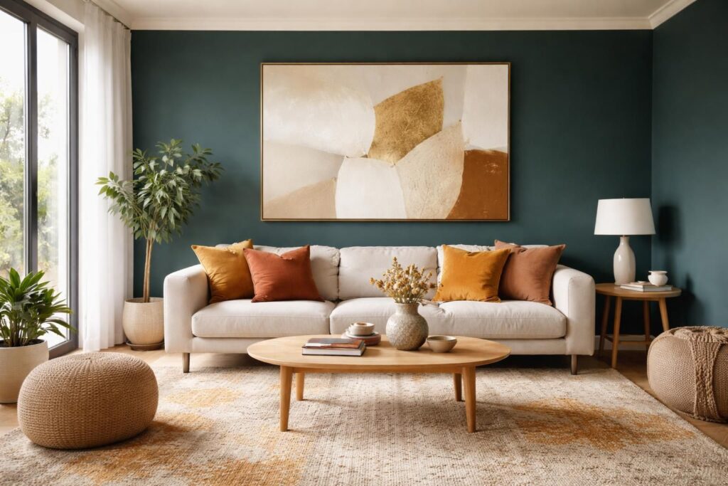 Un mur accent vert canard dans le salon peut devenir le point central de l’espace. Cette couleur valorise les éléments architecturaux comme une cheminée, surtout lorsqu’elle contraste avec du blanc. Le mobilier élancé en bois clair se marie particulièrement bien, ajoutant une touche de légèreté.
