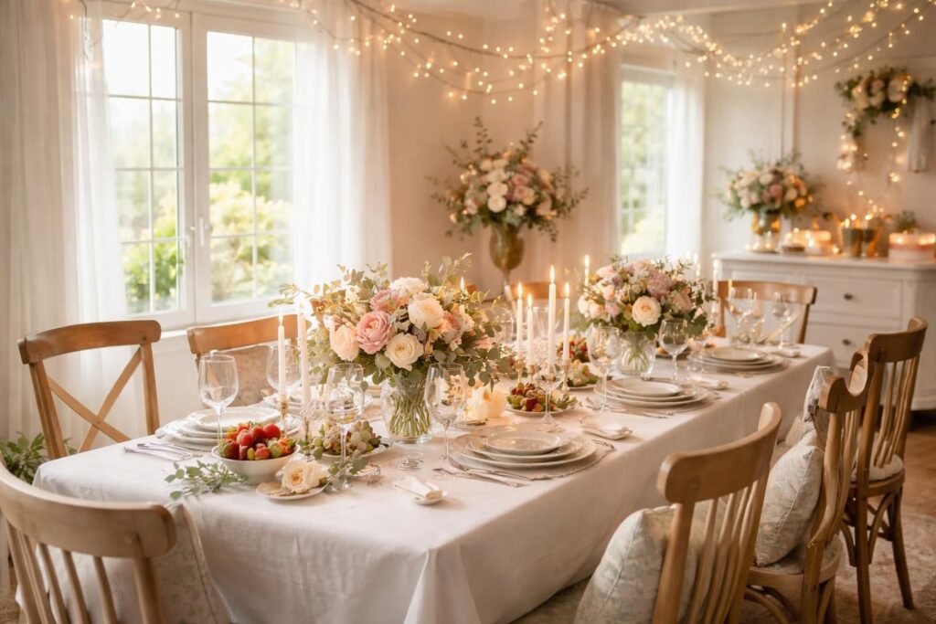 - Romantique : optez pour des tons pastel, des fleurs délicates et des bougies pour une ambiance intimiste.