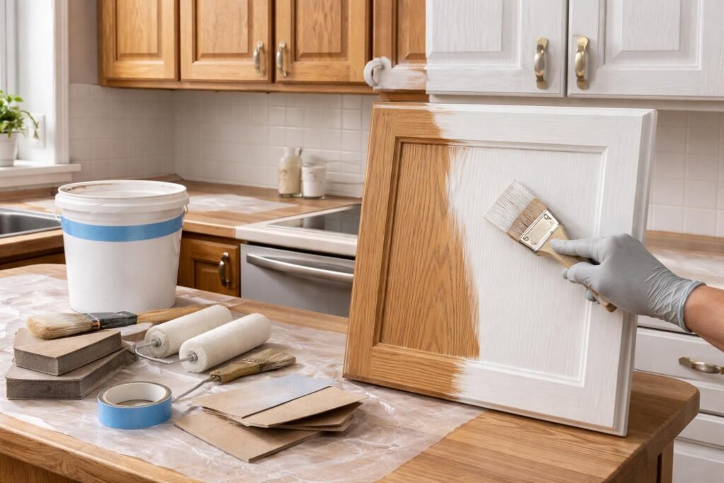 Commencez par nettoyer chaque surface en profondeur. Utilisez un dégraissant, comme le TSP (phosphate trisodique), qui est efficace pour éliminer les impuretés et les graisses accumulées au fil du temps, en particulier près des zones de cuisson. Après avoir nettoyé, rincez soigneusement à l’eau claire et laissez sécher complètement. Cette étape est essentielle, car toute trace de graisse ou de résidu pourrait compromettre l’adhérence de la peinture ou des finitions.